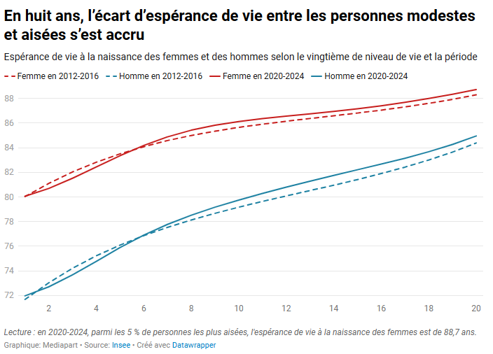 Selon une étude récente de l’Insee relayée par Médiapart dans son article du 15 décembre 2026, l’écart d’espérance de vie entre les plus riches et les plus pauvres atteint aujourd’hui jusqu’à 13 ans chez les hommes, et plus de 8 ans chez les femmes. Autrement dit, le niveau de vie pèse lourdement sur la durée de vie.